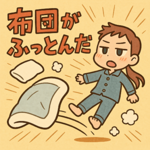 その布団が“風に吹かれて飛ぶ”という状況は、