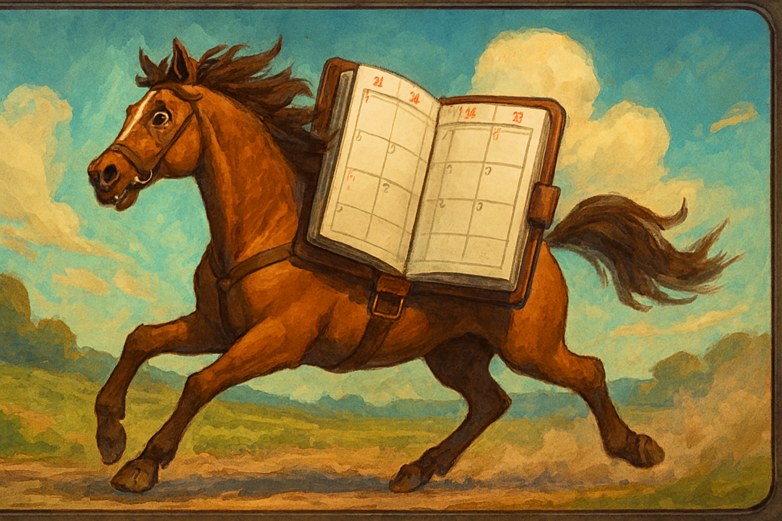 予定帳を背負って走る馬の姿は、まるで未来を背負って疾走する者の象徴のようだ。