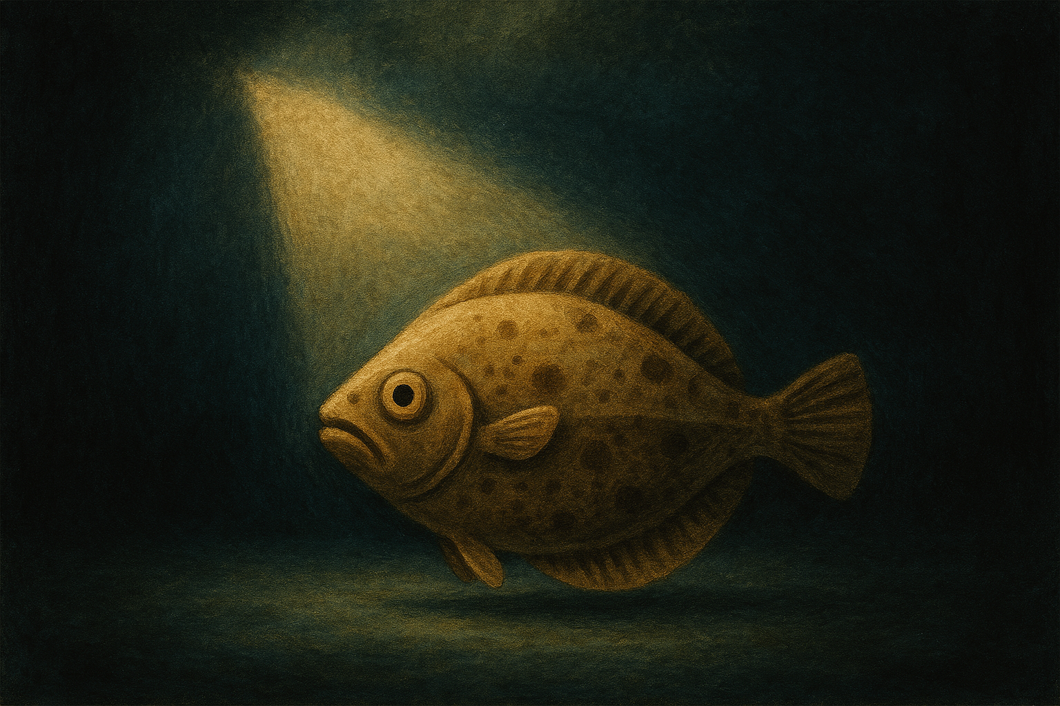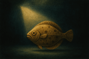 ヒラメのように、目立たず、静かに海底に身を潜める存在が、ある瞬間に閃きを得る――それは、思索の果てに訪れる啓示の瞬間です。